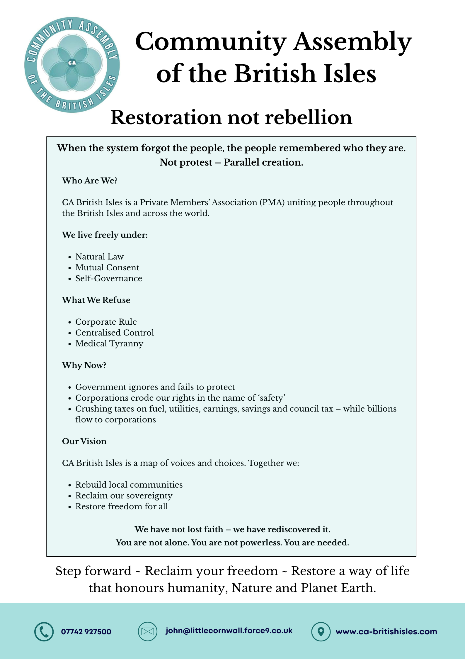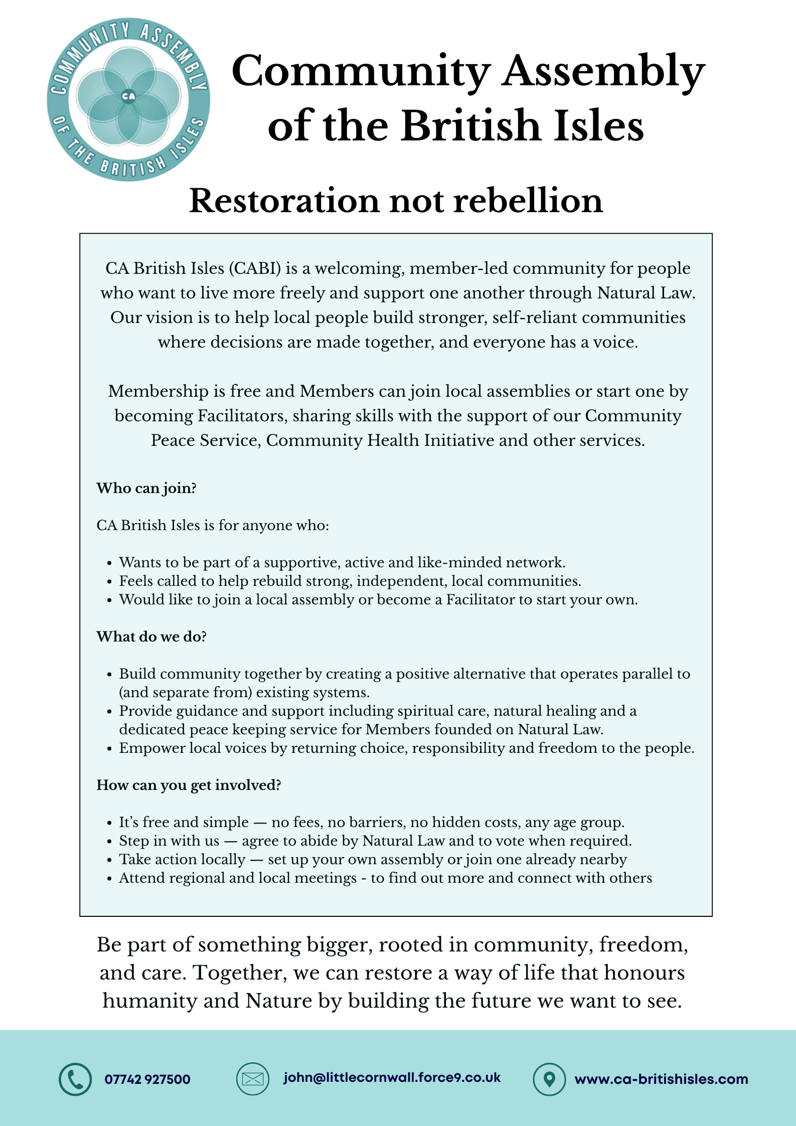 A flyer for the Community Assembly of the British Isles about what we do, who can join and how to get involved.