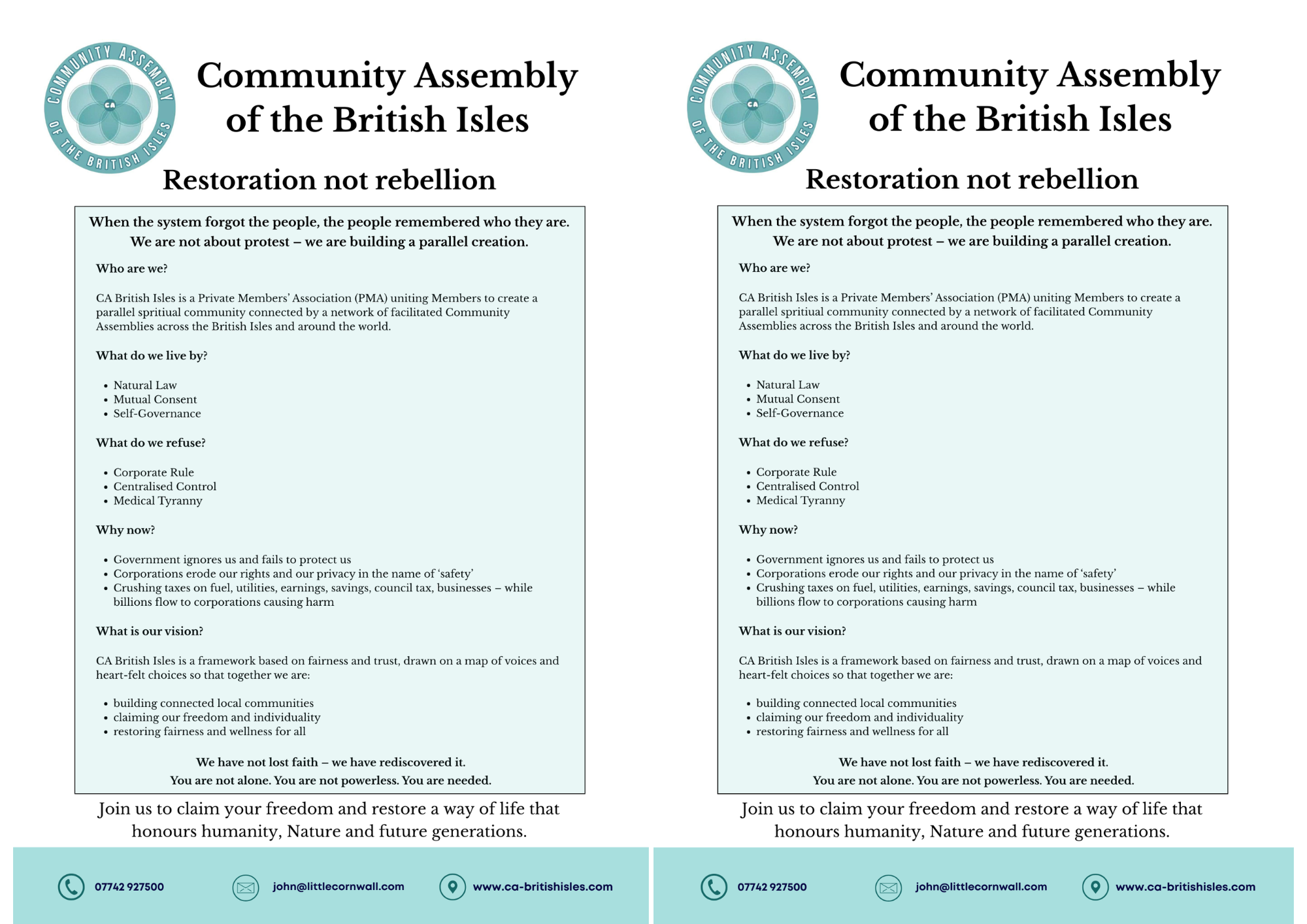 A short flyer that sets out how we live freely under Natural Law, what we refuse, why now and what is our vision.